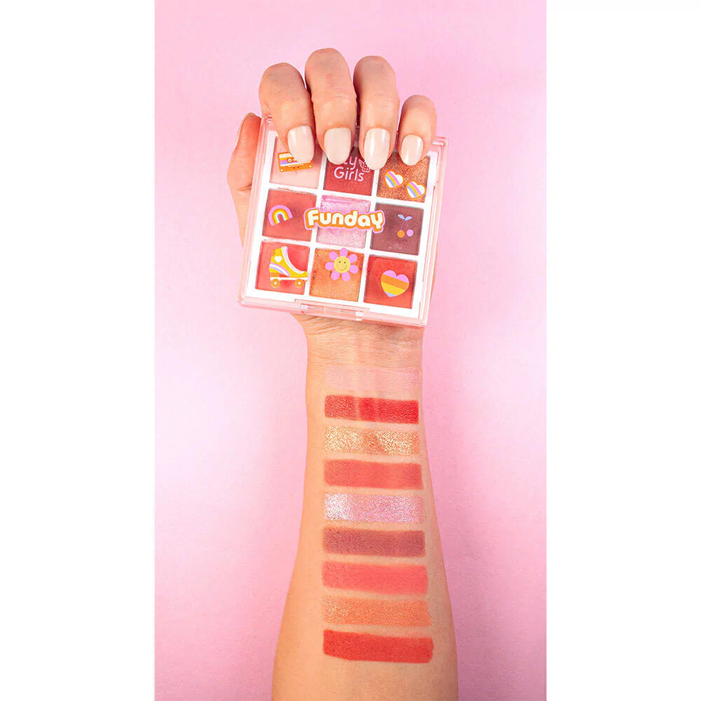 Para um dia divertido, nada melhor do que uma paleta de sombras que vai levantar seu astral, não é? A Funday é tudo isso e ainda vai te deixar mais linda do que você já é! Possui uma embalagem muito fofa e "fun", com ilustrações que representam tudo o que é mais good vibes, com itens de uma pegada mais retrô, tipo um patins e óculos em formato de coração! São no total 9 sombras super pigmentadas e com cores lindíssimas, que tem uma cartela desde tons mais neutros até os mais coloridinhos para todos os seus "moods"! Têm acabamentos matte e cintilantes e, além disso, algumas sombras possuem relevos de desenhos fofos para te animar ainda mais! Você vai se encantar por todo esse charme que a Funday exala, não deixe se garantir a sua, hein? Disponível nas versões A e B.